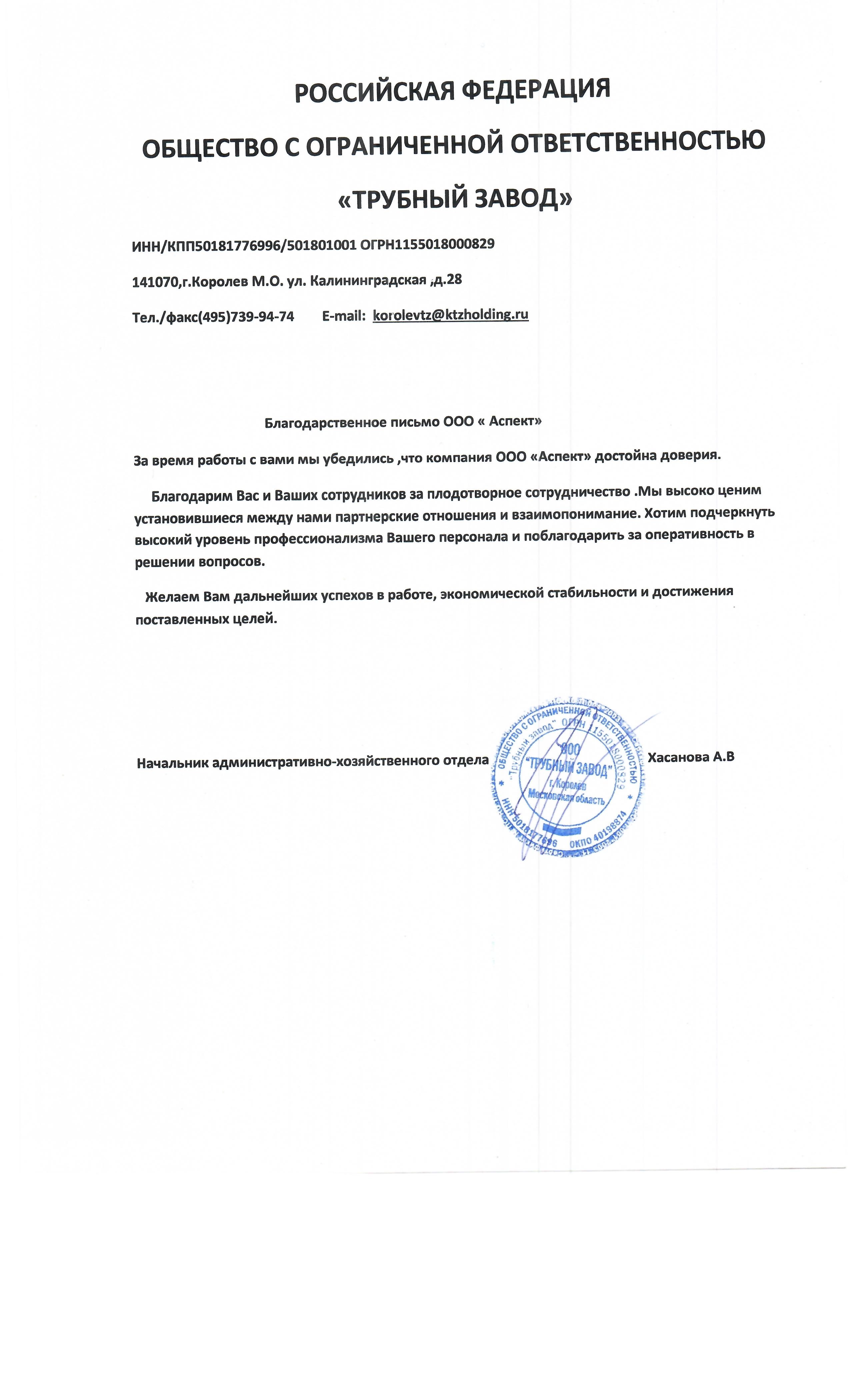 Выражаем глубокую признательность и искреннею благодарность вашей компании ООО «АСПЕКТ»‚ за качественные и своевременные
