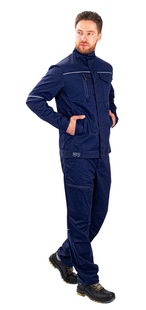 В нашем интернет-магазине "Аспект" представлен костюм, который сочетает в себе стиль, надежность и высокую функциональность. Этот комплект состоит из элегантной куртки и брюк, выполненных в темно-синем цвете с элегантными аккуратными акцентами василькового оттенка.